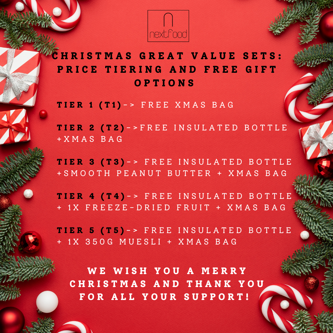 TIER 1 (T1)*: Buy 3x 350g Box Nextfood Muesli + 2x 50g Nextfood Freeze-dried Fruits - Free Xmas Bag
